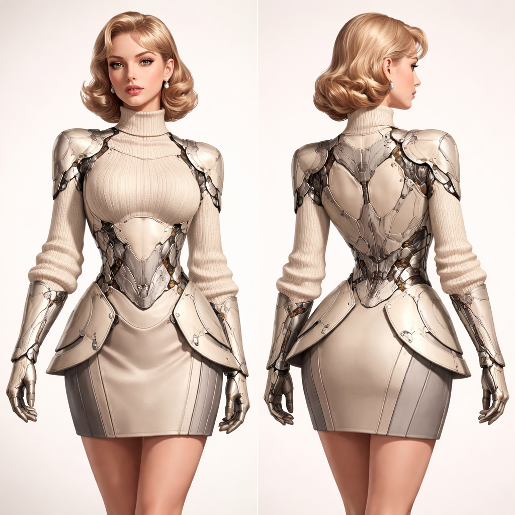 Trend: future armour Layered torso silhouette, blending organic curves with mechanical hinge joints: shows soft armour. She wears a sweater. More structure and soft power , fifties style, show front and back