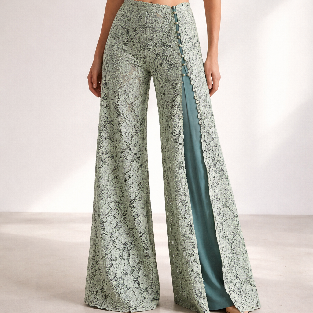 luxury sage green guipure lace wide-leg pants low waist structured floral lace overlay teal lining underneath extra wide leg silhouette decorative side opening with loop buttons elegant minimal fashion design studio lighting