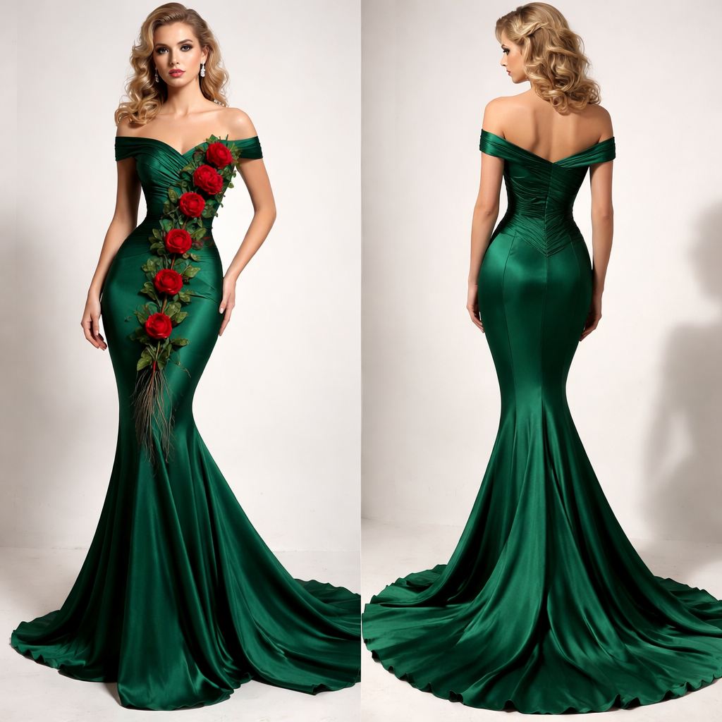 Silk green fabric, . Eight whole red roses, with roots reaching their waists and leaves, stand upright at chest level, arranged diagonally from left to right, from highest to lowest. and the back mermaid shape, long dress