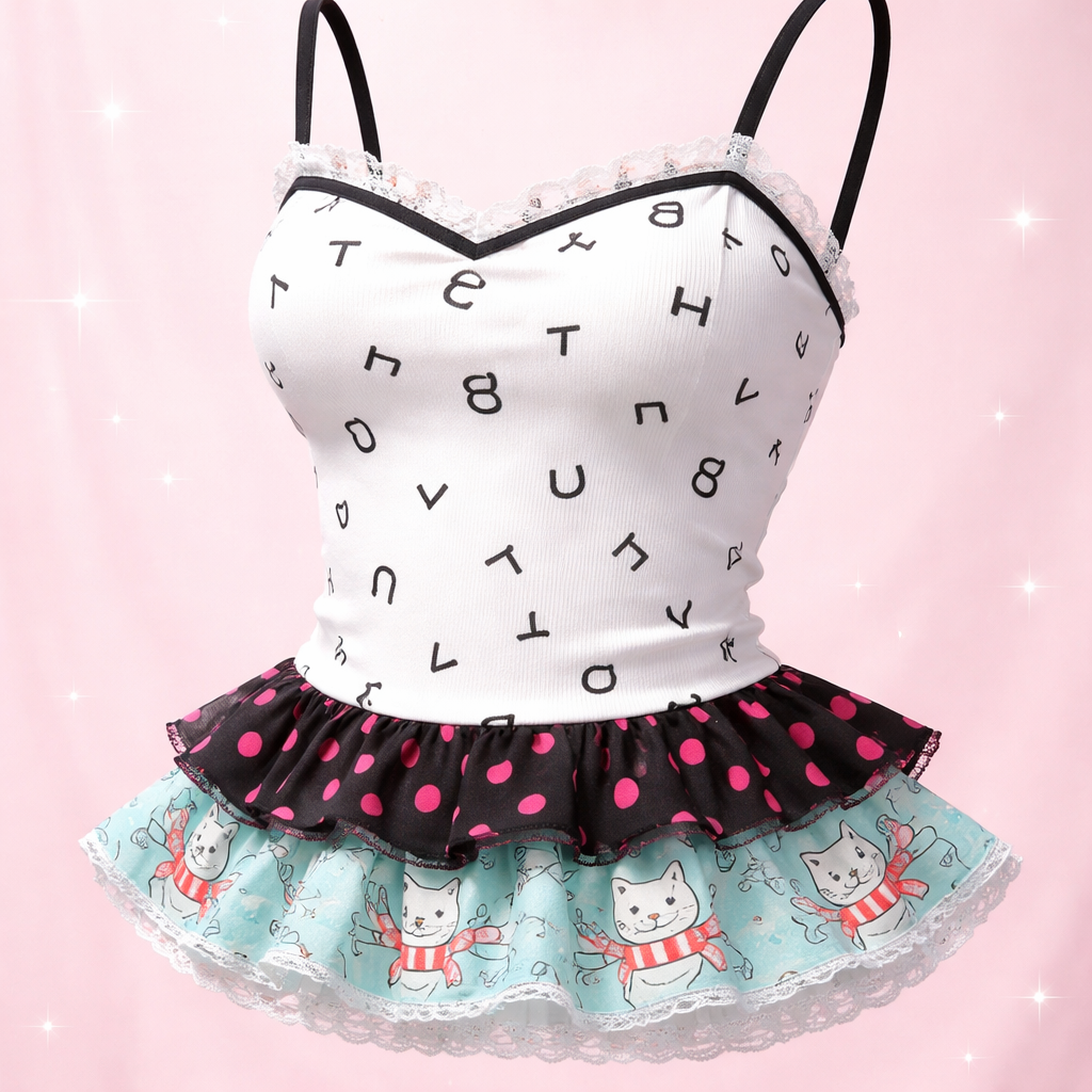 Korean Fashion fashion design: Cute white cotton feminine tank top, slim fit, with random black Phoenician letters. Features two layered ruffles: one in black with hot pink polka dots, and a second with aqua cat line drawings with red stripes.