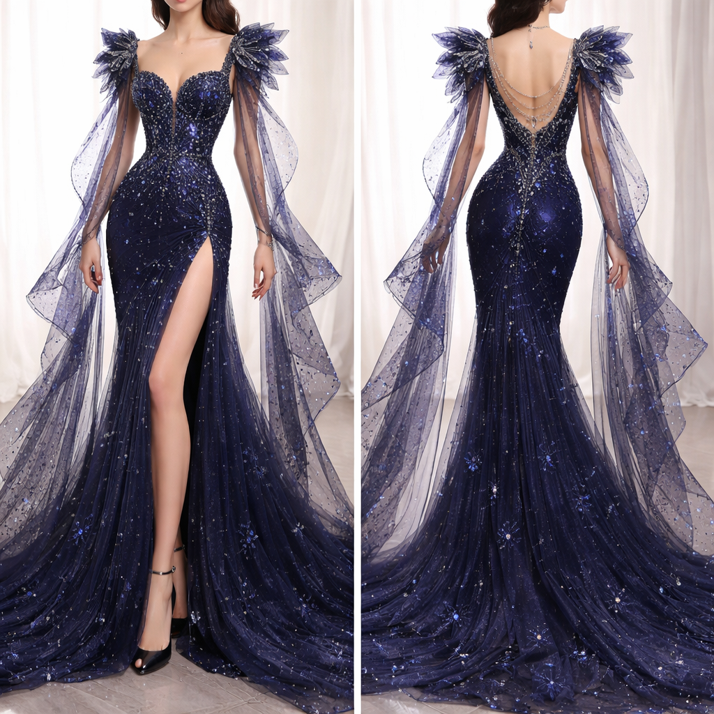 Create me a prom dress it must be long It must be tight on the top until the hips and drop down straight after that into a light not tight skirt. It must be a dark color. It must be the most creative dress that no one’s done before. , show front and back