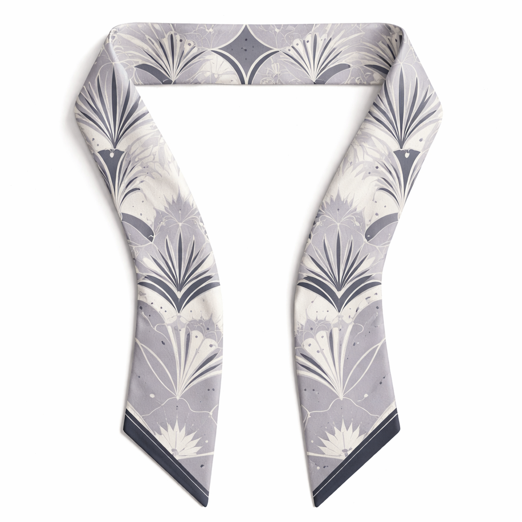 Design a silk scarf that is 5 x 86cm that wraps around a handle of a handbag The scarf is for the 2026 world cup and will be worn in the host city of Kansas City, MO. Design something with no logo or words but is simple feminine and soft and a touch of art deco in • Soft grey • Pearl white • Near-black ink , classic style, show front and back