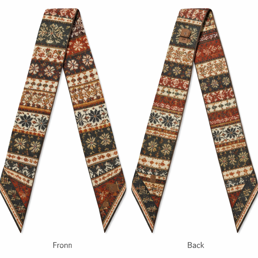 Silk scarf that is 5x86cm designed for a handle on a Kelly style bag that is fair isle pattern, vintage style, show front and back