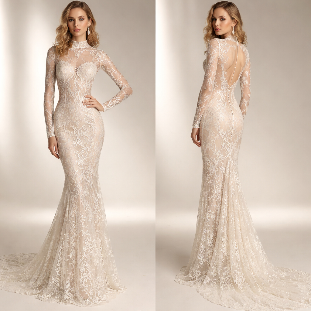 Luxury Italian designer evening dress made entirely of delicate lace. Elegant fitted long dress with a high lace neckline and long transparent lace sleeves. The bodice has a subtle corset structure under the lace that sculpts the waist and creates an hourglass silhouette. The lace pattern is floral and refined, slightly more transparent on the sides to emphasize the waist. The dress is slim and fitted through the hips and legs, with a sophisticated and elegant silhouette. High-end couture aesthetic, inspired by Italian luxury fashion houses. Editorial fashion photography, minimal elegant background., show front and back
