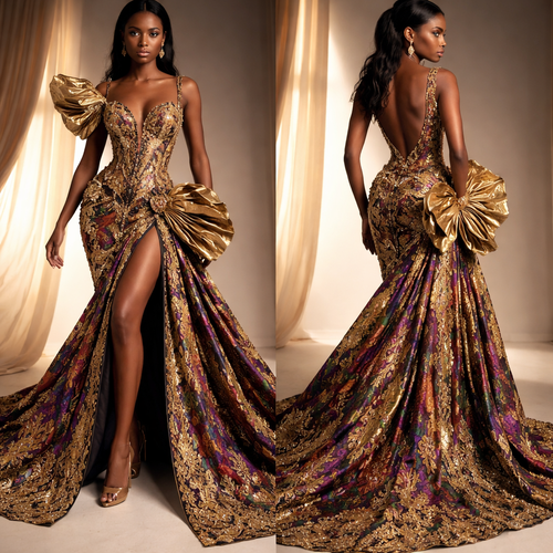 Create a high couture, ultra-luxurious evening gown using authentic African kente textiles, designed with elegance, pre...