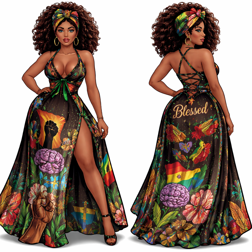 Black pride, indigenous pride, West Indian pride, mental health awareness, Faith in God, modest and sexy but not too revealing , pinup style, show front and back