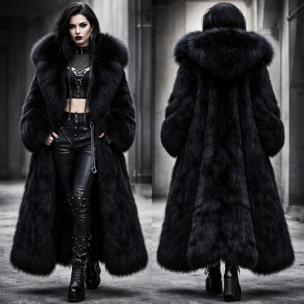 black long fur coat with an unturned collar, wide and fluffy fur, health_goth style, show front and back