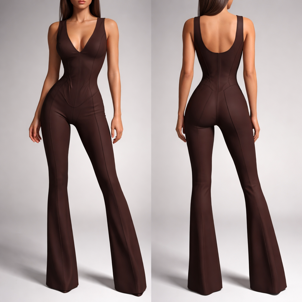 Ultra-realistic fashion design render of a women’s sculpting full-length flare-leg jumpsuit in deep matte chocolate brow...