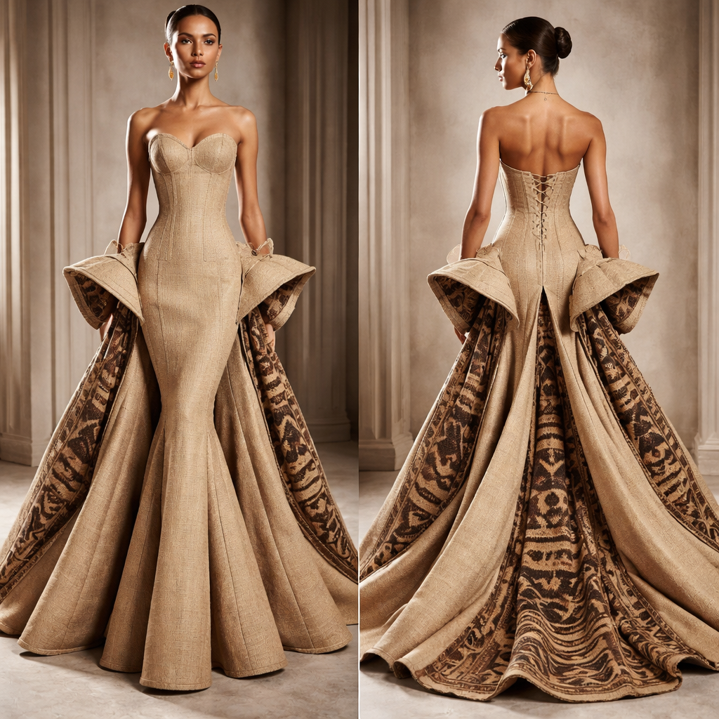 I want a dress in jute fabric snatched corset side hip panels and a structured standing train