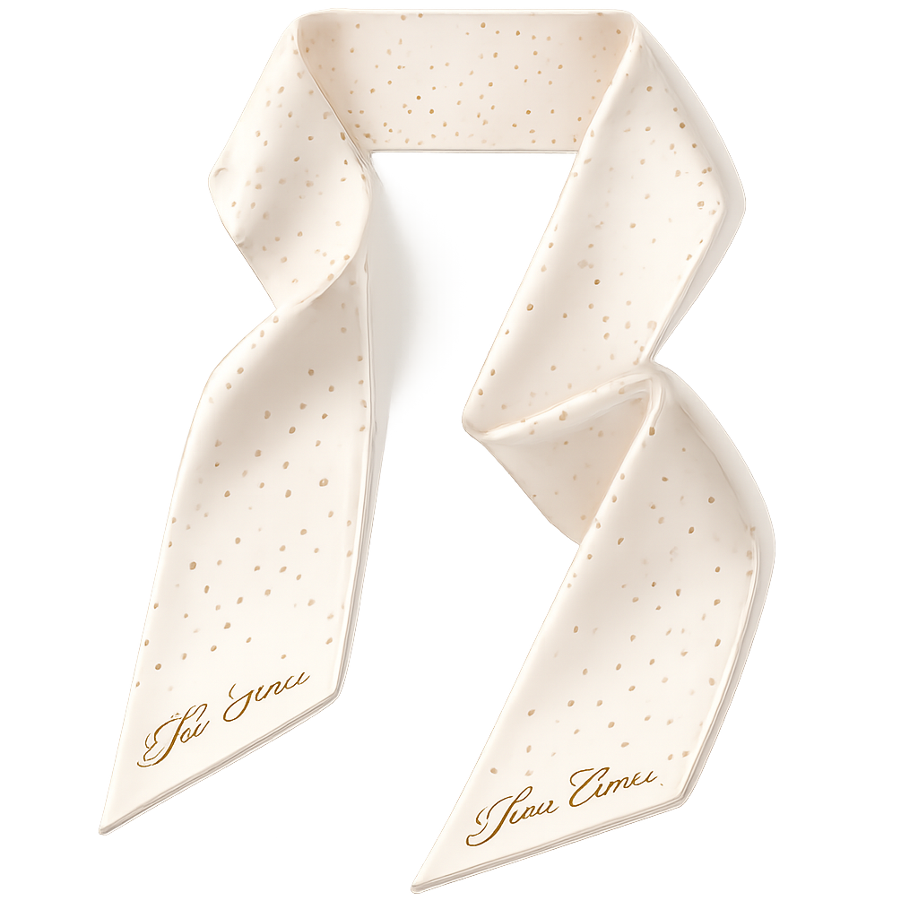 Design a silk scarf that is 5 x 86 cm with oblique edges. Micro Polka or Pearl Dot • Design: Tiny dots evenly spaced • Scale: 2–3 mm dots • Why: Reads clean from afar, elegant up close Gold foil dots on silk are especially stunning. Add my logo Jolie Franc at oblique edge , classic style, show front and back