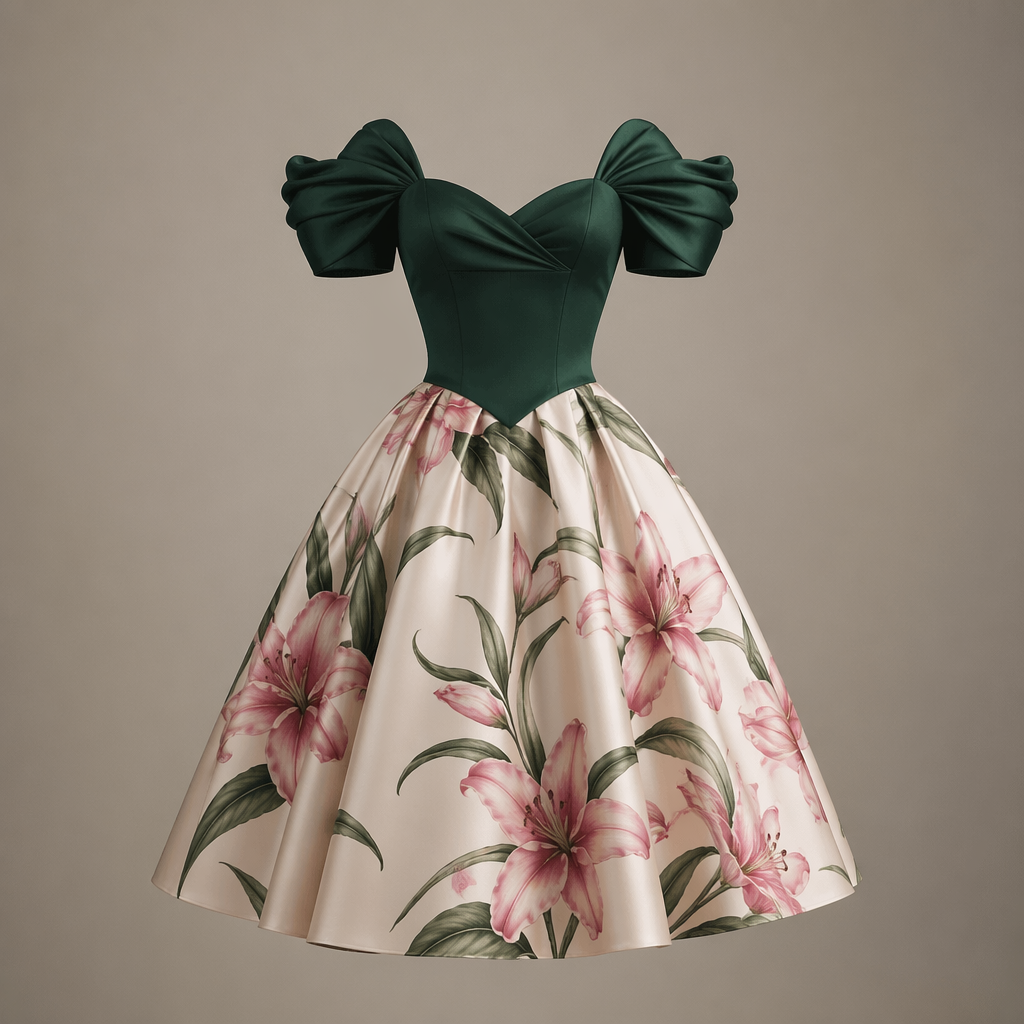 A Female Dress design, suitable for Spring. платье в стиле 50 годов, юбка полусолнце принт розовые лилии, лиф необычный однотонный темно зеленый, рукав интересный. Russia fashion aesthetics.