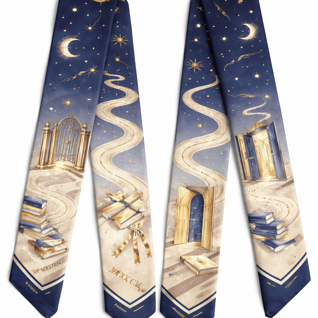 Design a silk scarf thanks 5x 86cm to be wrapped on the handle of a purse. 2. Graduation Journey Theme (Very On-Brand for Gifting) Celebrate the transition, not the institution. Motifs • Pathways, winding lines, or stair-step geometry • Constellations or stars (future, aspiration) • Keys, gates, or doors (new beginnings) • Roman numerals (e.g., MMXXVI) without referencing a school Design trick for 5 × 86 cm • Vertical progression from one end to the other • Works beautifully when wrapped—story unfolds subtly , classic style, show front and back