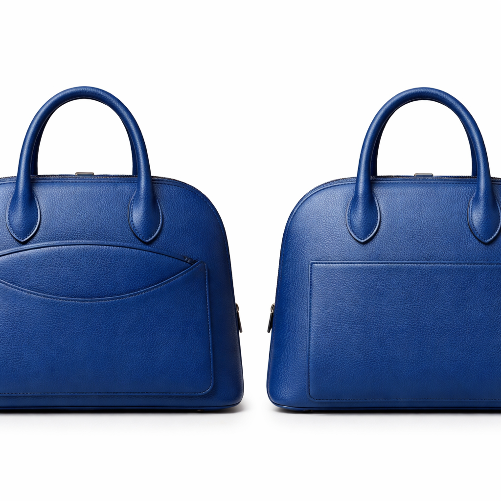Male me a leather bowler bag unisex in the stile of hermes bolide. No hardware. But different than hermes. Make in royal blue textured leather. Add a unique front pocket. , business style, show front and back