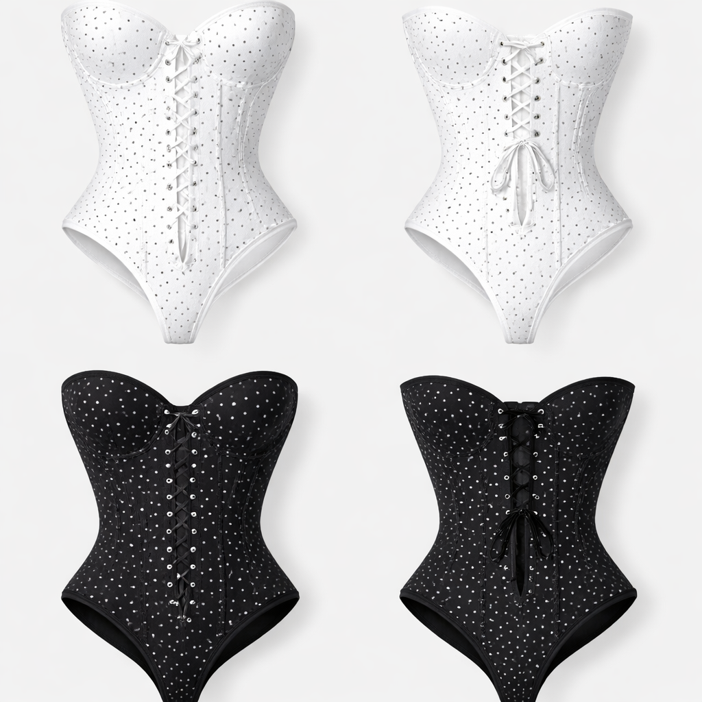 Shape wear no ai model all cotton seamless g string white and black pocker dots strapless corset no built in bra just corset in bodysuit no undies other way around black and white pocker dots