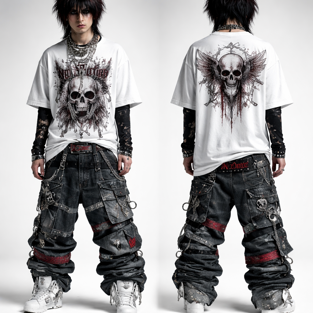 help me come up with conc emo swag not wore anywhere to help me style my giuseppe zanotti sneaker shoe..2 or 3 waist layered customised baggy jeans and customised long shirt, emo style, show front and back