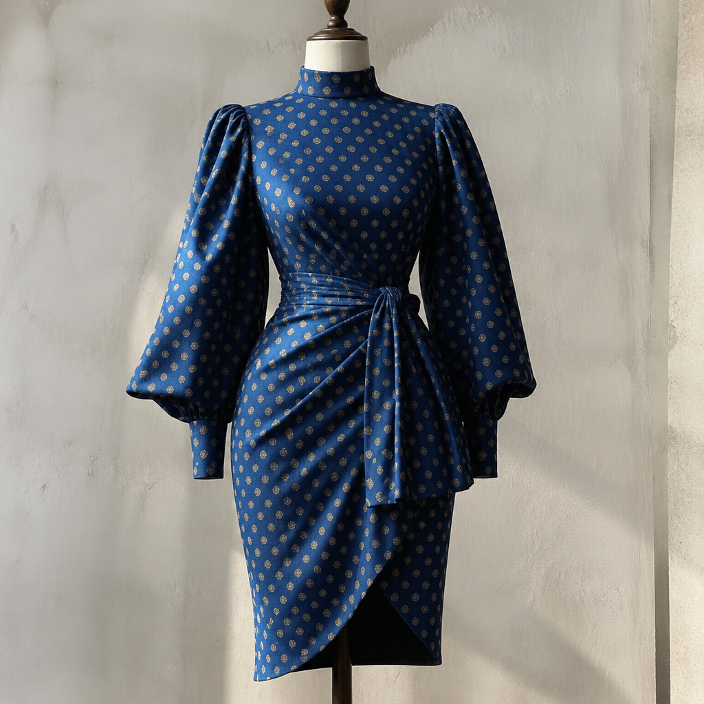 photorealistic fashion design, A Female Dress design. Consider South African fashion — diverse multicultural styles, Shweshwe prints, modern Afro-chic. Current season is Autumn in South Africa., just the design no text