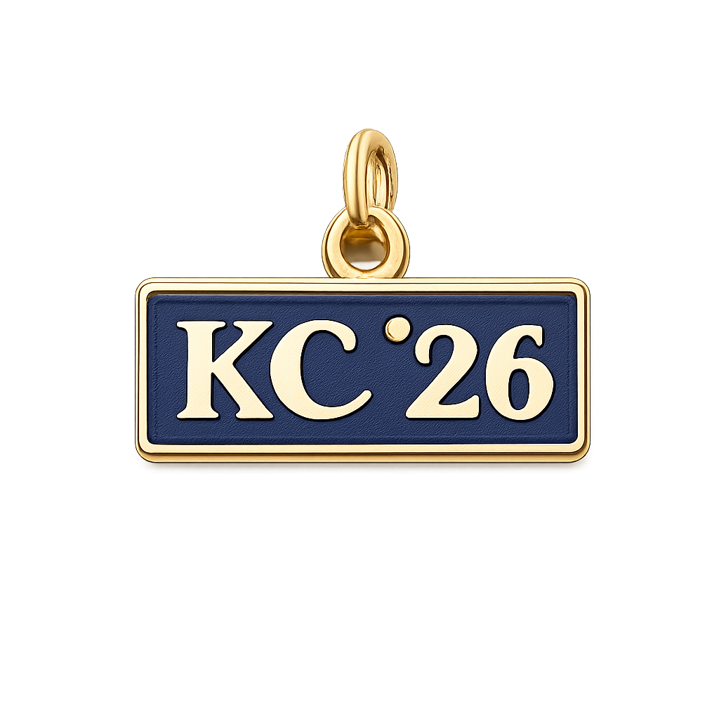 Design a 1 inch enamel charm that says KC ‘26 in rectangle design use blue letters and white background with gold as the...