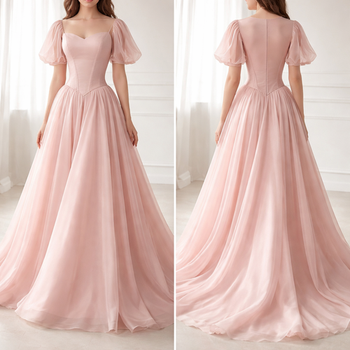 I want a long, elegant gown made from silky pink organza with a silk lining underneath so it is fully opaque and not see...