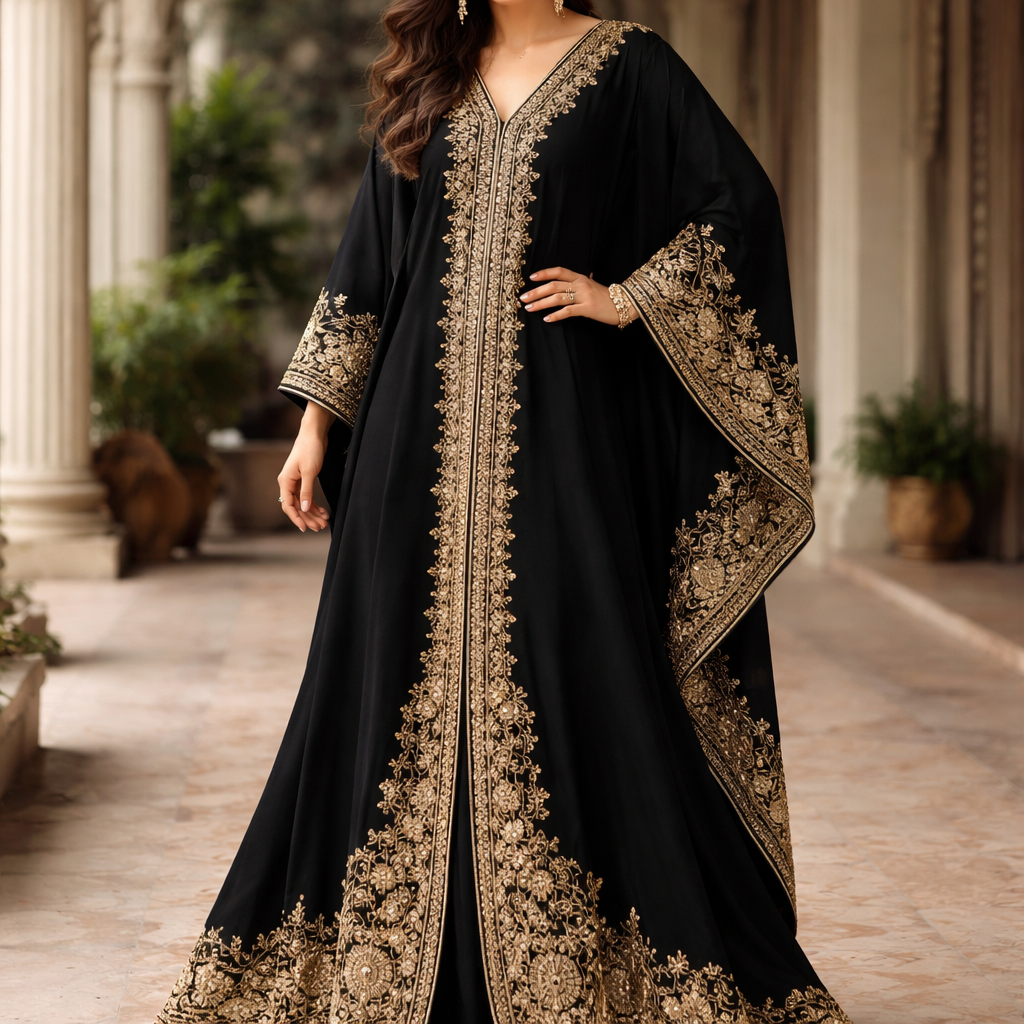 Make a long black kaftan with traditional pakistani handwork on the borders of the kaftan. Hand work shall be in golden in colour