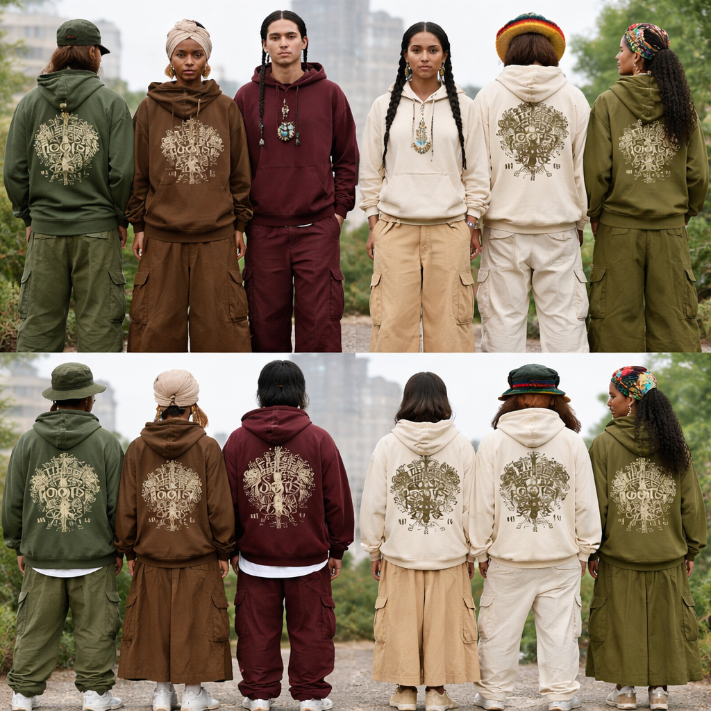 Black men, Black women, Native American men, Native American women, West Indian men, West Indian women, Three roots in grace, modest, streetwear style, show front and back