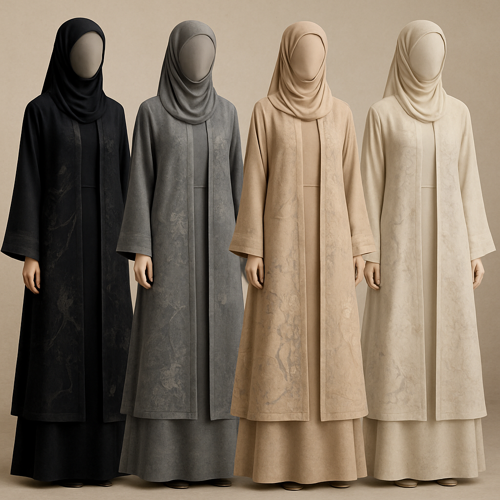 Create a modest two piece chic abaya , the first of its kind, featuring a unique stone design that exudes a classy and sophisticated vibe. I'd like four designs, each showcasing different styles and fabrics. Incorporate high-end, unique chic stone designs to make them truly special. Add little sophisticated stone designs.