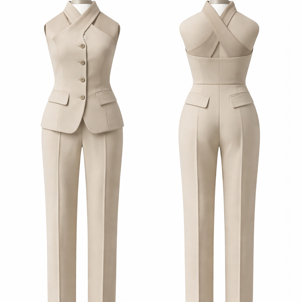 Two piece suit set. Three button straight down in the middle on the top on a breasted halter crossed neck top Japanese halter, thick suit. All beige symmetrical pockets, no drooping., business style, show front and back