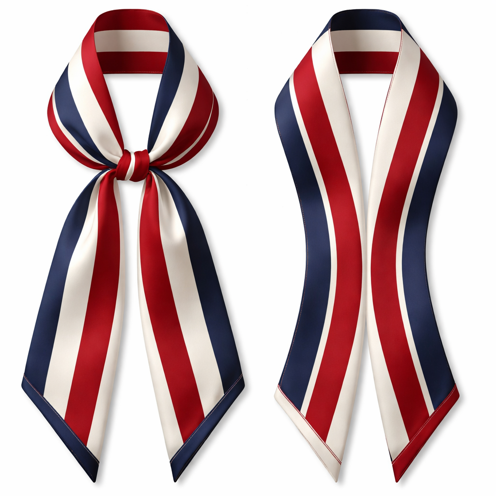 Design a silk twilly using united states national flag colors. No logos and use longitudinal lines , classic style, show front and back