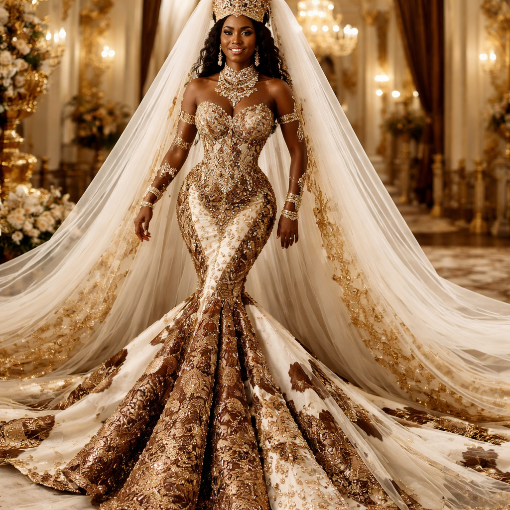 Extravagant Congolese traditional wedding masterpiece, dramatic couture gown with huge royal volume, 12-meter veil, brown, gold and ivory tones, luxurious Congolese fabric integrated in high-fashion structure, subtle cow skin details, gold embroidery, milk and honey symbolism in texture and embellishment, regal African queen silhouette, wearable couture, strong wow effect, luxury editorial, masterpiece entrance dress, traditional jewelry inspired by makalit, ultra dramatic but elegant. Very body fitted with a Glock attached for the extra length