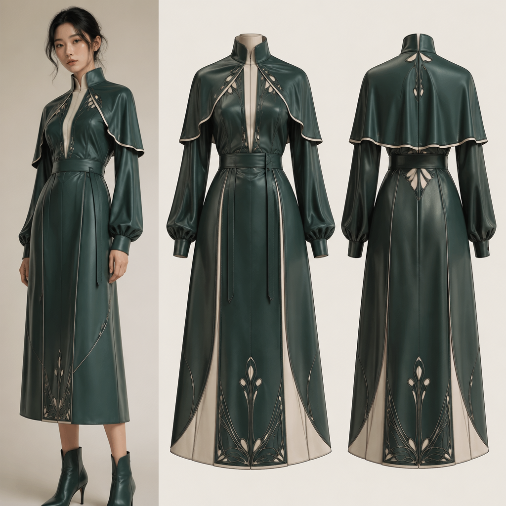 A Female Dress design, made of Leather, suitable for Spring, in Korean Fashion + Art Nouveau + Haute Couture style. squi...