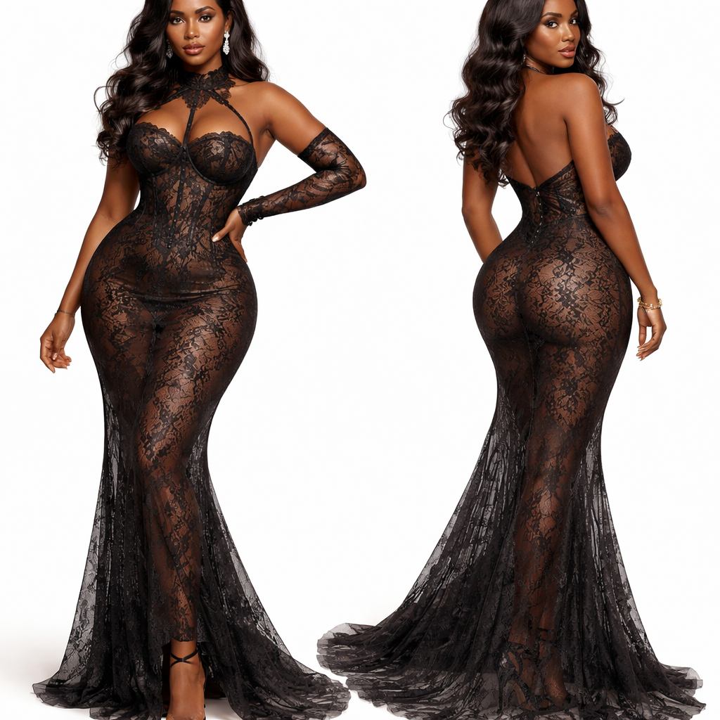 Black lace evening gown with a halter neckline. Sheer floral lace fabric, corset-style structured bodice, form-fitting silhouette emphasizing waist and hips. Floor-length mermaid cut with a soft train. One arm styled with a long black lace glove (asymmetrical styling). Place the outfit on a curvy African female model with size 16 proportions (bust 44, waist 37, hips 45). Full hips, defined waist, soft stomach, and natural curves. Smooth dark skin tone. Model pose: dynamic editorial stance — slight hip pop, torso subtly angled, one hand on hip, the other relaxed. Confident and elegant posture. Styling: soft glam makeup, nude glossy lips, defined brows, voluminous dark wavy hair. Add statement earrings, minimal luxury accessories, and heels. Clean fashion sketch / semi-realistic rendering style. Focus on accurate garment fit, fabric drape, and body proportions. White or nude background., show front and back
