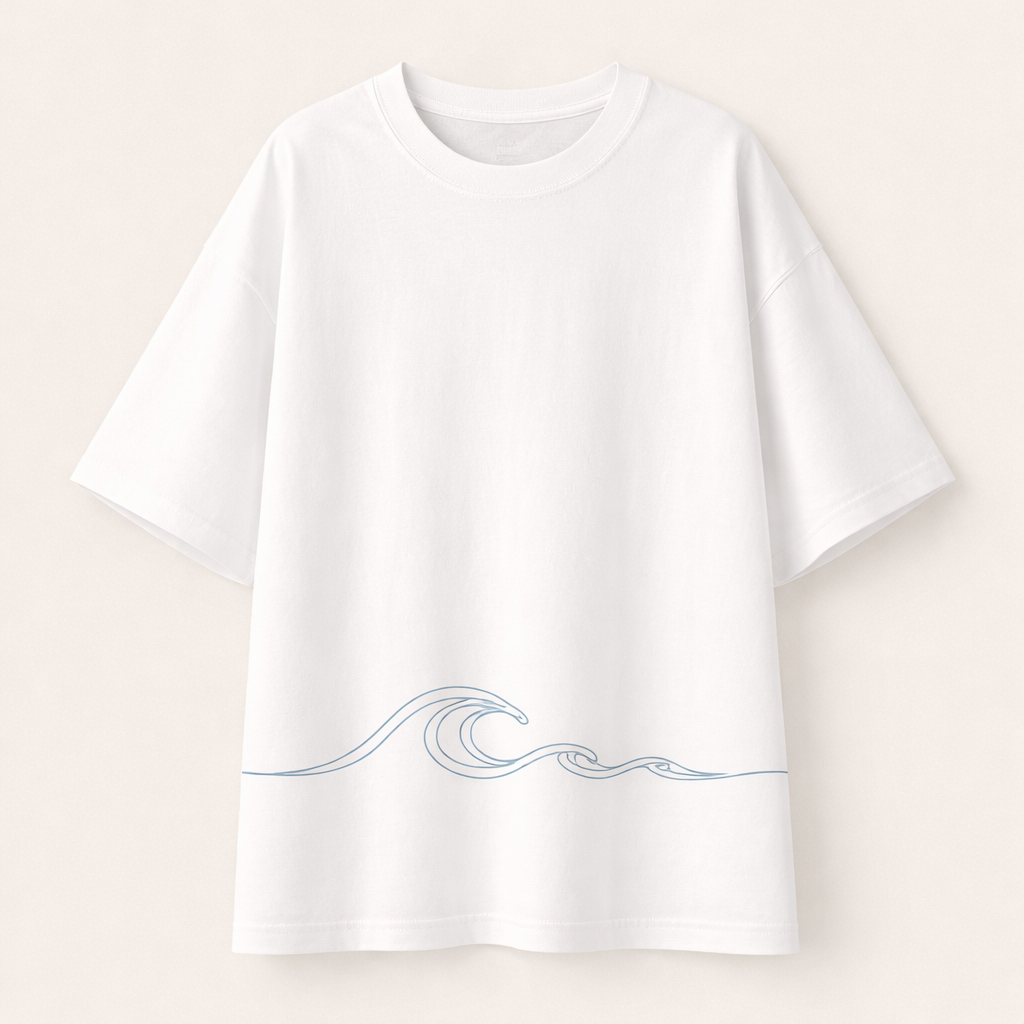 Cotton t-shirt, relaxed fit, oversized silhouette. Minimal wave line drawing, single color, placed low on the shirt.