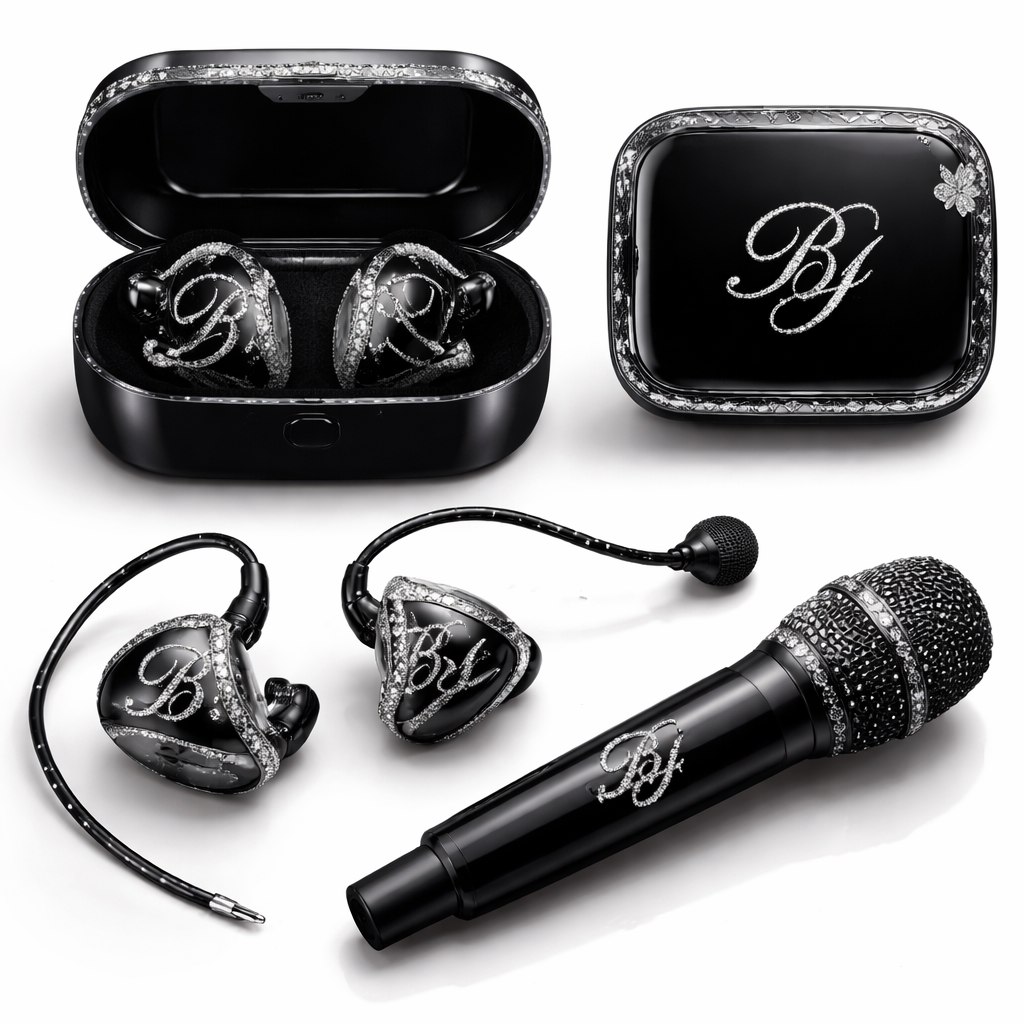 Ear piece and case and microphone matching delicate swarosky BJ written professional for stage more sophicatted not so childish like Lana del rey vibe in black colour more delicate and feminine in silver and black , show front and back