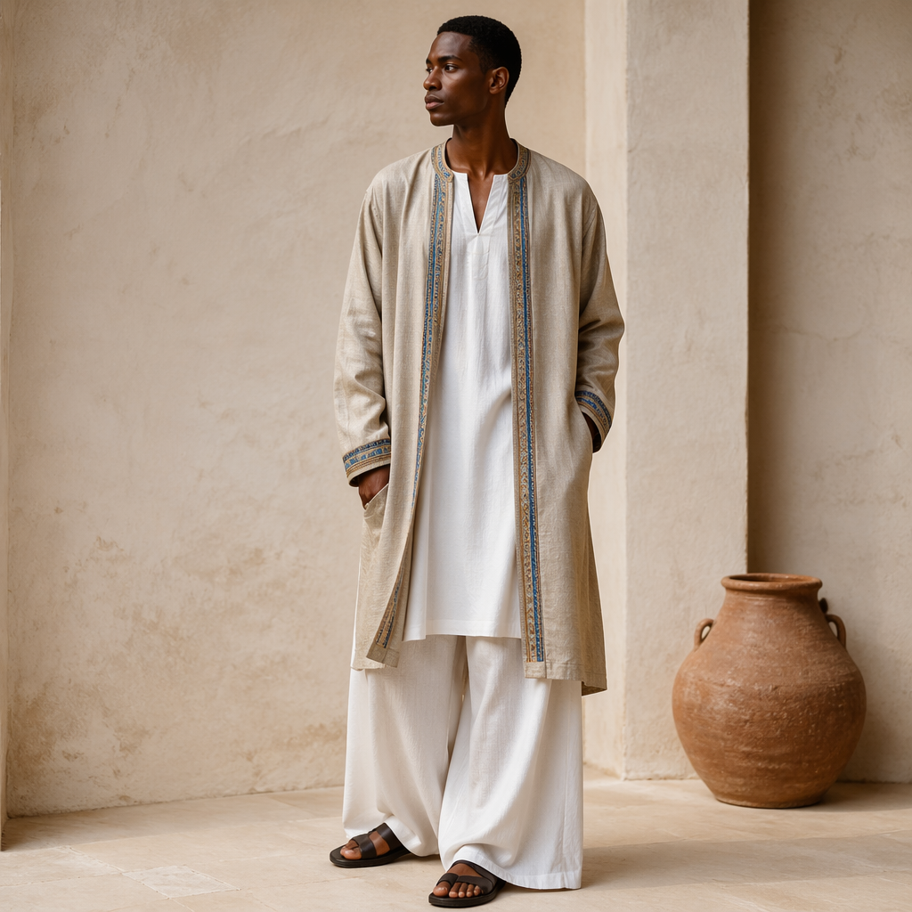 A Male fashion design. Consider Egyptian fashion — flowing silhouettes, vibrant colors, cotton and linen traditions, modest yet elegant. Current season is Spring in Egypt.