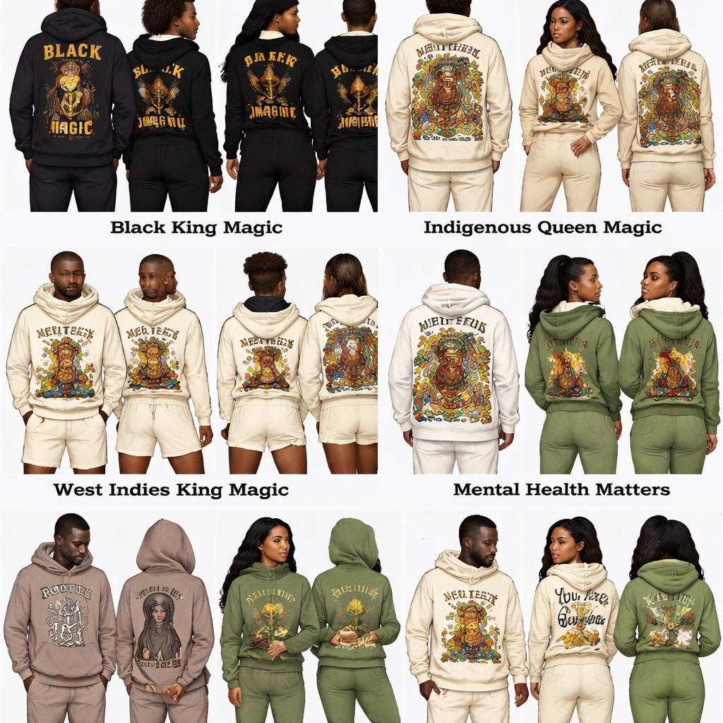 Black king magic, black queen magic, indigenous king magic, indigenous queen magic, West Indies king magic, West Indies queen magic, middle eastern, rooted in faith, mental health awareness , lounge style, show front and back