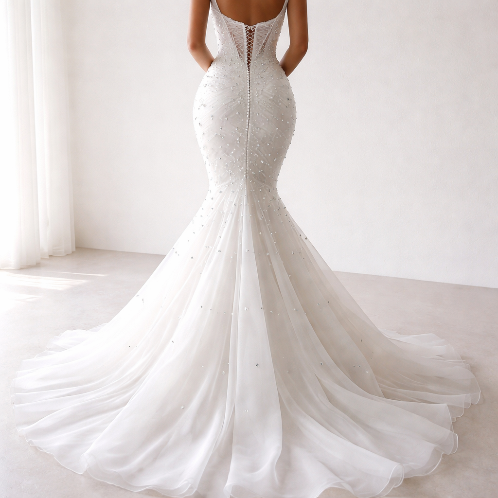Creates a wedding gown in white liquid organza material. Mermaid style. Strapless. With Diamond stones 2 inches apart from each other on the bodice and skirt up till the knee or where the mermaid flare starts. Show me the back only.