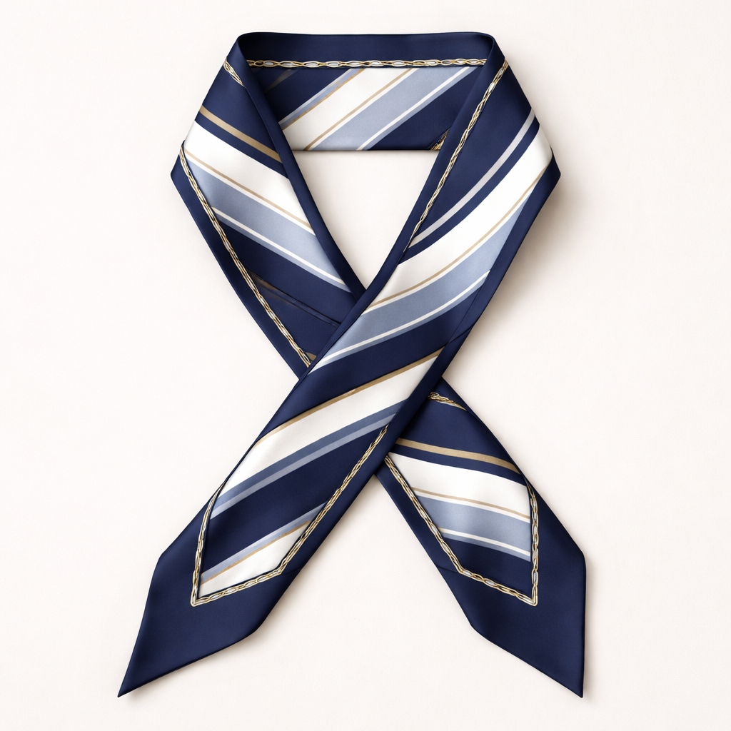 Design a 5x86cm silk scarf. Classic, elegant. Simple iconic pattern using different shades of 1 or 2 colors. Angled edges.