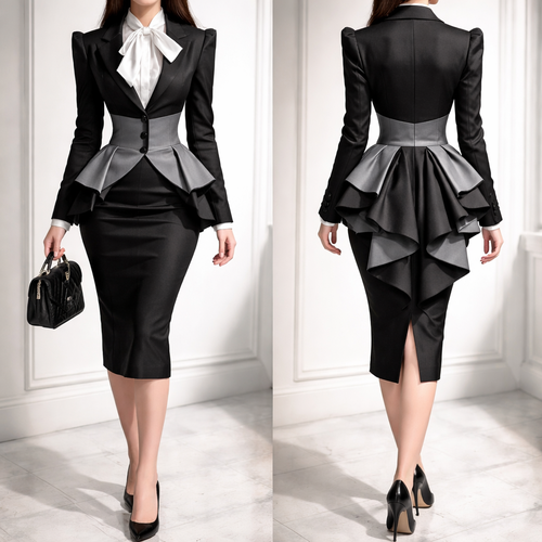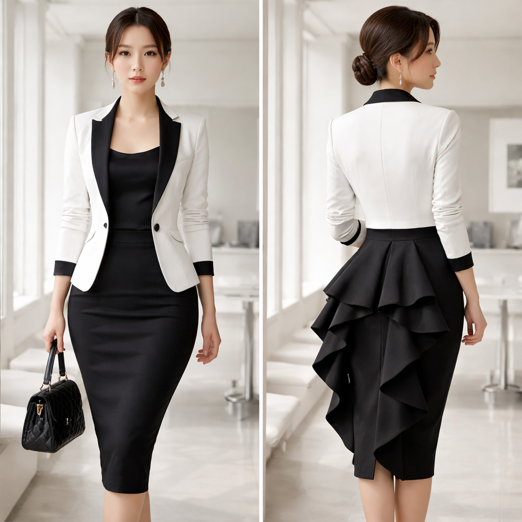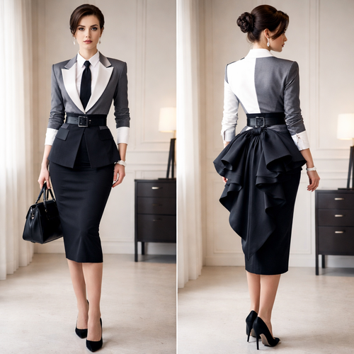 Real clothes, modern office wear, bustle, monochrome style, show front and back