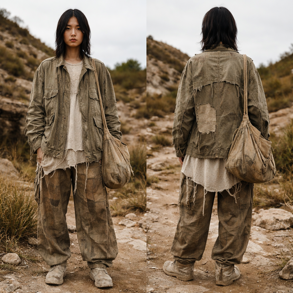 Unearthed Outdoors-driven, earthy looks are recontextualised within a more design-led aesthetic, with a wabi-sabi quality being key. Design strategies Weathered, rustic aesthetics apply a connection with the elements, offering a direction for outdoors and utility themes Uneven layering, irregular textures, proportion play and #RawEdges underpin this story, with non-conforming, size-inclusive silhouettes key for genderless ranges Soil, rocks and minerals influence colour, prints and texture. Extend this Earth-first approach to fabric choices prioritising GOTS-certified and GRS/RCS recycled cotton, natural fibre blends and FSC-certified Tencel lyocell This story is also very much about resilience and resourcefulness, so experiment with #DeadstockDesign, creative mending and repairing Ones to watch: Song for the Mute’s (Australia) The Desert Rose collection evokes the beauty and resilience found in harsh environments, embodying perseverance and growth. Pearled Ivory’s (US) deadstock leather jackets evoke natural landscapes. Kartik Research (India) uses Kantha stitch, hand block-printing, natural dyes and weaving in contemporary cuts for its ‘Indian Future Vintage’ styles Relevant for: utility, outdoorwear, denim, outerwear, knitwear songforthemute_1732862032_35...Song for the Mute , minimalist style, show front and back