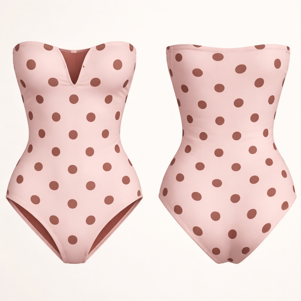 shape wear body suit strapless pink and brown pocker dots no ai models v cut other way around all same fabric , minimalist style, show front and back