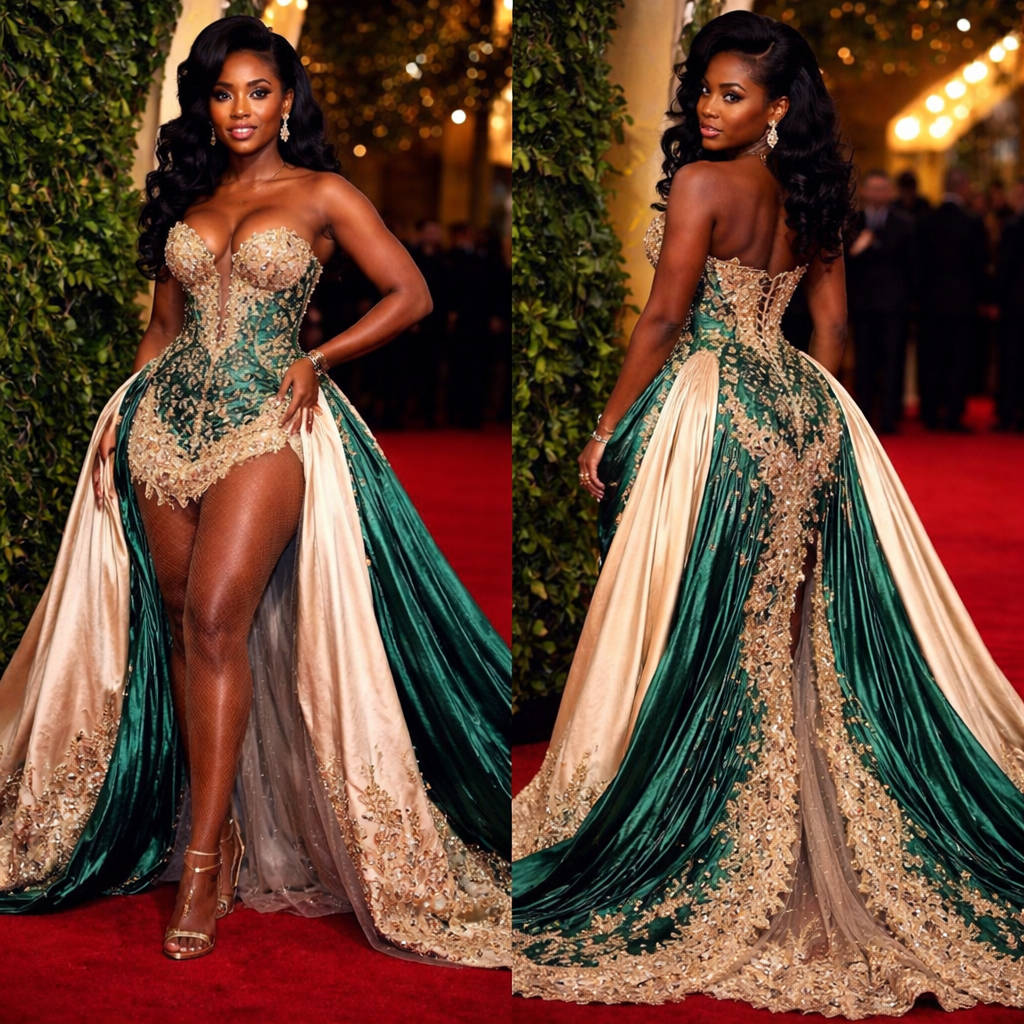 Dress for a premier with emerald greengold and cream with a long train over skirt , short under skirt with mesh netting legs ,fitted corset bodice lace accents gold detailing low cut bodice More dramatic ( for a short black woman very curvy , show front and back