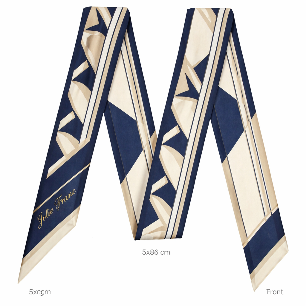 Design me a silk scarf that is 5x 86cm to be wrapped on the top handle of a handbag. It need to be iconic for my brand Jolie Franc. It would be classic geometric and tailored More simple and more iconic . It needs to be Jolie Francs identifiable signature look no chains