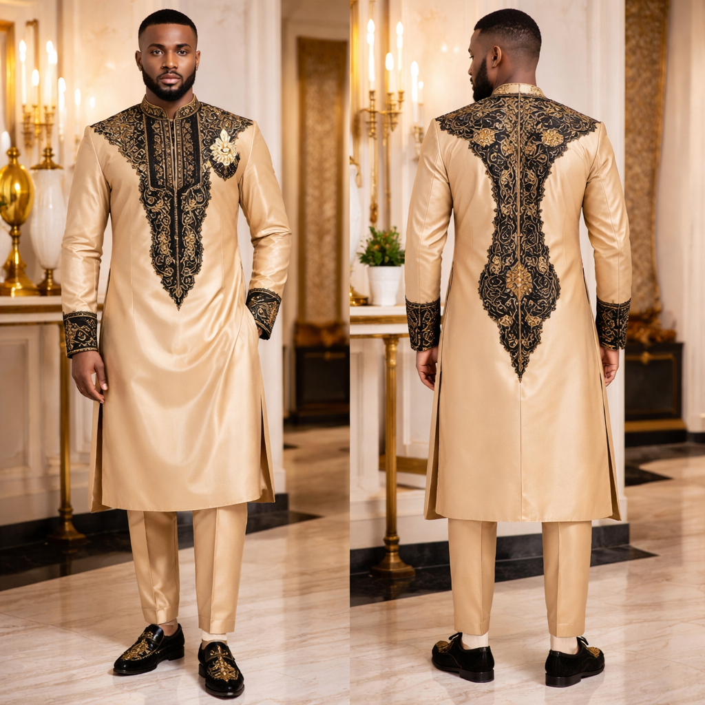 African male Kaftan in Champagne, black and gold colours , cultural style, show front and back
