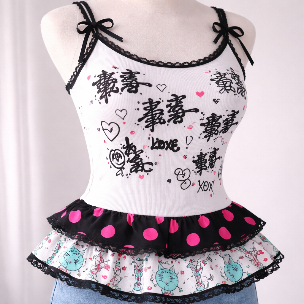 Korean Fashion fashion design: Cute white cotton feminine tank top, slim-fit. Black Asian graffiti randomly placed. Two layered ruffled hems: first, black with large hot pink polka dots; second, line drawings of cute aqua cats with red stripes. Black spaghetti straps with small black bows.
