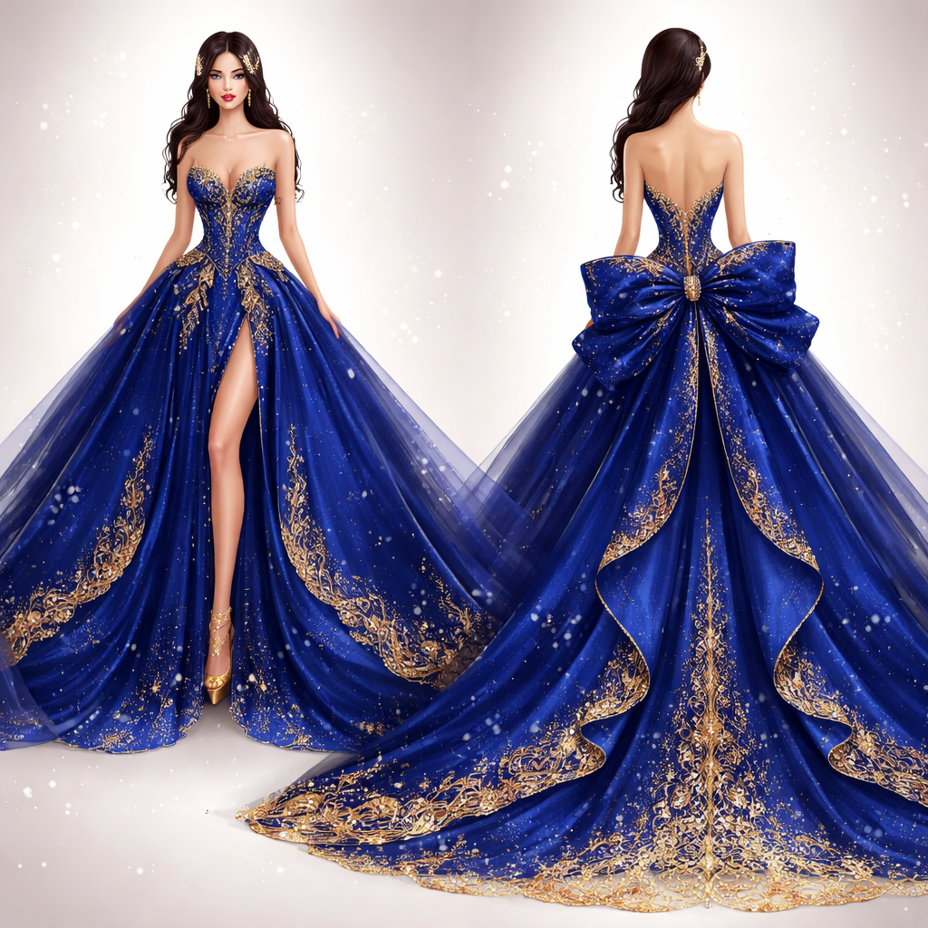 Draw an blue and gold, really dramatic prom dress , show front and back