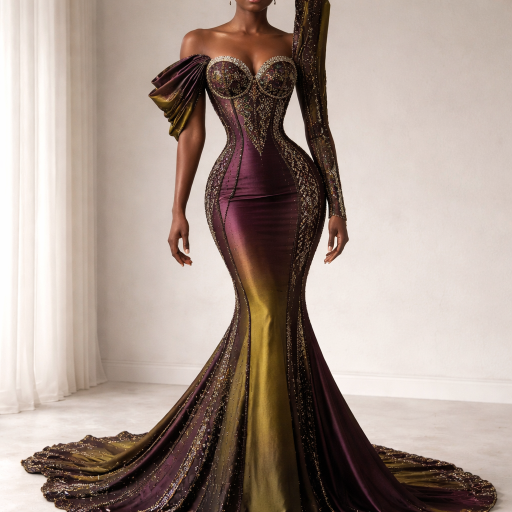 Create a high couture, ultra-luxurious evening gown using authentic African kente textiles, designed with elegance, precision, and editorial sophistication. The gown should be primarily constructed from a plain ombré kente fabric, blending deep plum into deep olive green (olive oil tone) in a seamless, rich gradient. The fabric must appear lustrous, heavy, and expensive, with a soft sheen that enhances the depth of both colors. The dress should feature a highly structured corset bodice, sculpting the waist with clean, sharp tailoring. The underbust cups must be crafted from traditional kente pattern fabric, incorporating deep plum and deep olive tones within the pattern, with subtle complementary accents if needed. The pattern should feel authentic, bold, and regal, standing out against the ombré base. Design the neckline with dramatic asymmetrical shoulder structures using the patterned kente fabric: • One shoulder: a sculptural off-shoulder fold, draped elegantly with controlled volume • The other shoulder: a vertical, elongated structured fold, rising upward in a regal, architectural form Both shoulder elements must feel refined, balanced, and couture—sharp yet fluid, not exaggerated or costume-like. The entire gown—from the shoulder structures down to the hem—should be fully hand-beaded with luxurious detailing: • Use micro-beads, crystals, and fine embellishments in tones of plum, olive, and subtle metallics • Beading should trace the corset lines, enhance the hip curve, and follow the natural drape of the fabric • The embellishment should gradually intensify toward the hem and train, creating a rich, glowing finish The silhouette should be fitted through the bodice and hips, flowing into a controlled mermaid flare or sculptural train, maintaining elegance and fluid movement. The overall look must feel: • Extremely luxurious and high couture • Regal, powerful, and feminine • A flawless fusion of African heritage and modern haute couture craftsmanship The final result should be runway-ready, editorial, and globally competitive, with impeccable finishing, rich textures, and striking visual impact.