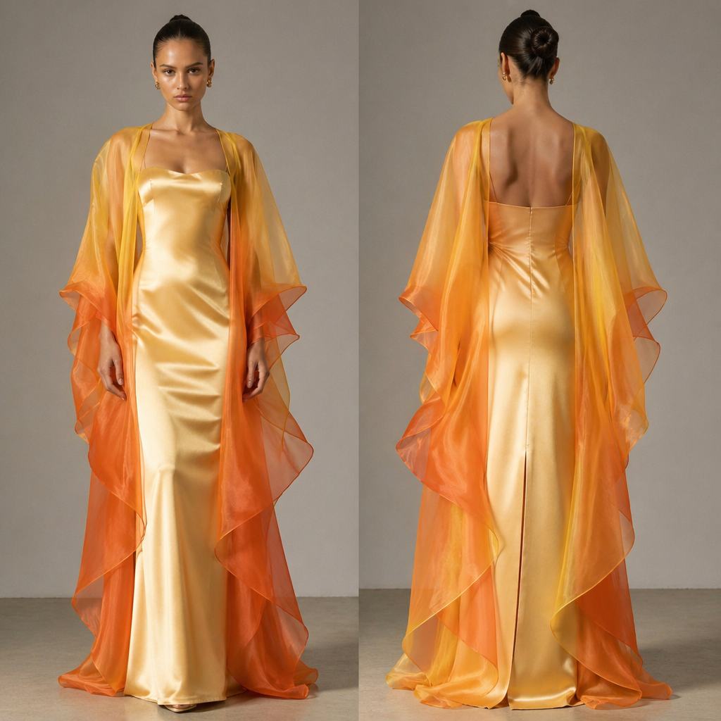 photorealistic fashion design, Make a satin tight straight dress with an organza throw on in yellow and orange palette , just the design no text, show front and back