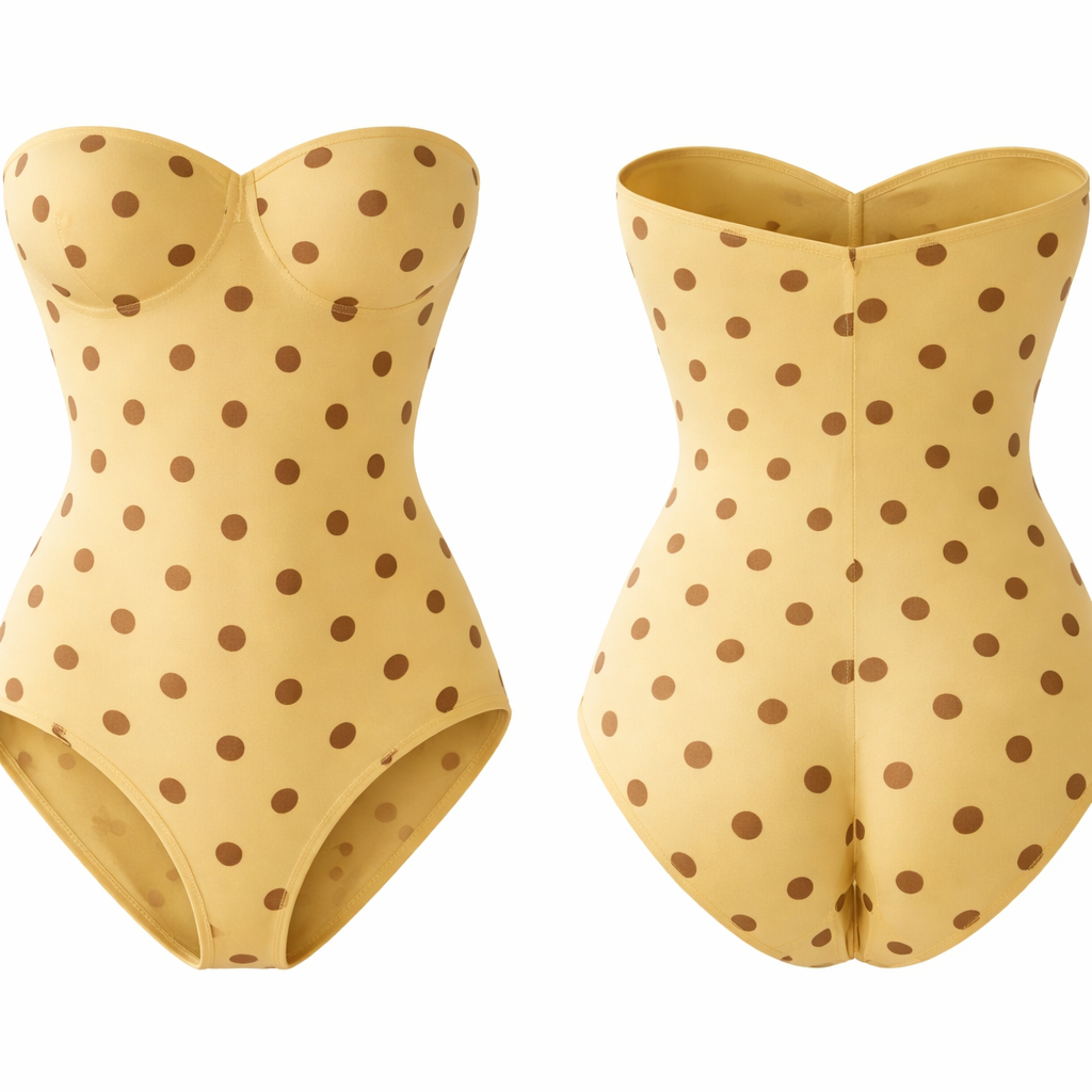 shape wear body suit strapless yellow and brown pocker dots no ai models v cut other way around all same fabric , minimalist style, show front and back