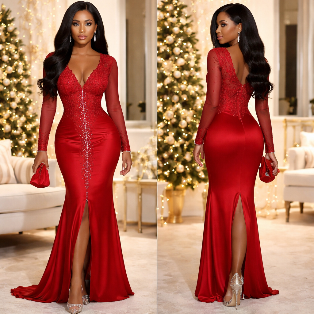 Create a Model wearing a Christmas Dinner Gown. The gown is red with a deep V neckline at the front. Diamond stones subtly start at the neckline and go down from the center to the center hem of the skirt. The bodice is lace and the skirt is silk. The bodice is long sleeve with lace and corset/boning that is visible because the bodice is semi- see through. There is no slit in the gown except for at the back for walking. The model is brown skin, with black long hair, wearing clear heels with small diamonds on them. The heels are pump stilettos. The model is carrying a red purse. Realistic looking photography picture for a fashion designer’s website. , glamorous style, show front and back