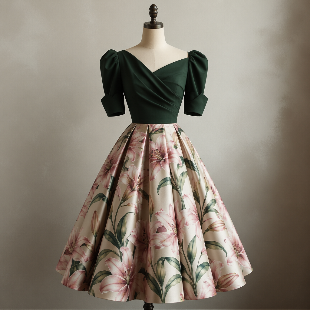 photorealistic fashion design, A Female Dress design. платье в стиле 50 годов, юбка полусолнце принт розовые лилии, лиф необычный однотонный темно зеленый, рукав интересный. Russia fashion aesthetics., just the design no text