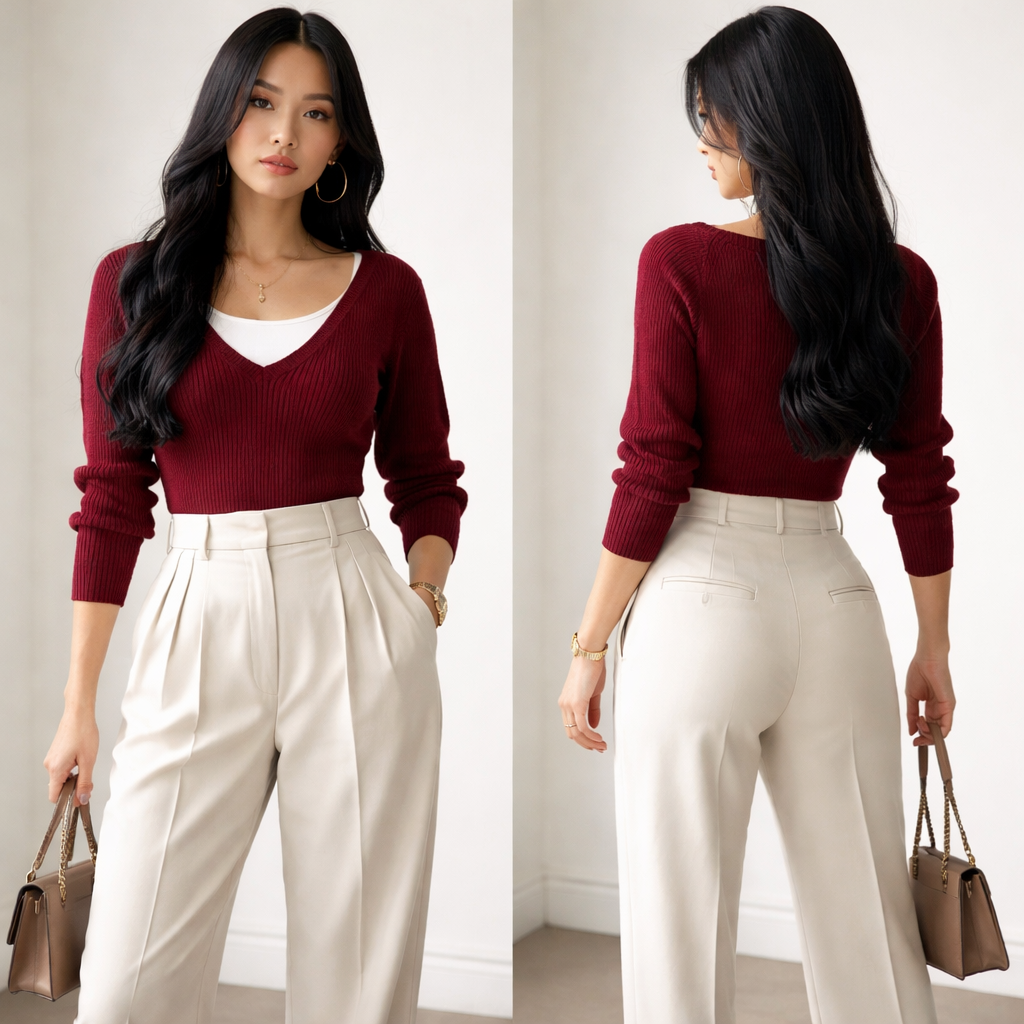 Formal pants pleated and shirt should be like inside whhite top outside sweter pant colour is offwhite and top burgandy the hair should be long and black in colour , show front and back
